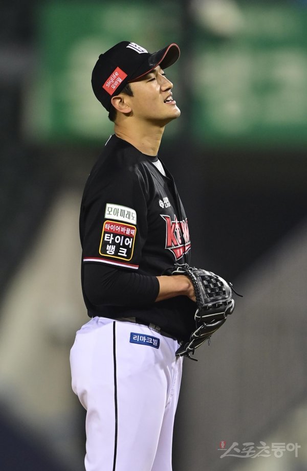 19일 서울 잠실야구장에서 열린 ‘2022 신한은행 SOL KBO리그’ LG 트윈스와 KT 위즈의 경기에서 6회말 LG에게 몸에 맞는 볼로 주자를 출루시킨 KT 고영표가 아쉬워하고 있다.
