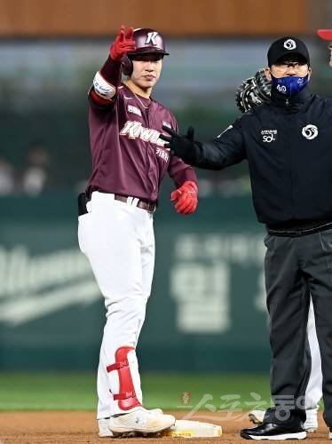 19일 인천 SSG 랜더스필드에서 ‘2022 신한은행 SOL KBO리그’ SSG 랜더스와 키움 히어로즈의 경기가 열렸다. 6회초 무사에서 키움 송성문이 2루타를 날린 후 세리머니를 펼치고 있다.