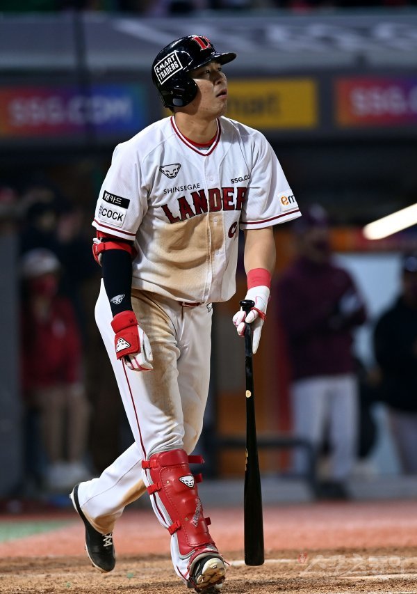 19일 인천 SSG 랜더스필드에서 ‘2022 신한은행 SOL KBO리그’ SSG 랜더스와 키움 히어로즈의 경기가 열렸다. 7회말 1사 만루에서 SSG 한유섬이 헛스윙 삼진 아웃으로 물러나고 있다.