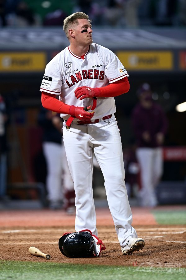 19일 인천 SSG 랜더스필드에서 ‘2022 신한은행 SOL KBO리그’ SSG 랜더스와 키움 히어로즈의 경기가 열렸다. 7회말 2사 만루에서 SSG 크론이 삼진 아웃으로 물러나고 있다.