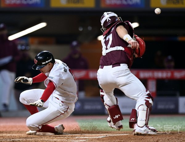 19일 인천 SSG 랜더스필드에서 ‘2022 신한은행 SOL KBO리그’ SSG 랜더스와 키움 히어로즈의 경기가 열렸다. 7회말 무사 만루에서 SSG 2루 주자 박성한이 적시타 때 키움 박동원의 실책을 틈타 득점을 올리고 있다.