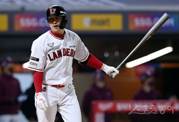 19일 인천 SSG 랜더스필드에서 ‘2022 신한은행 SOL KBO리그’ SSG 랜더스와 키움 히어로즈의 경기가 열렸다. 7회말 무사 만루에서 SSG 최정이 플라이 타구를 날린 후 아쉬워하고 있다.