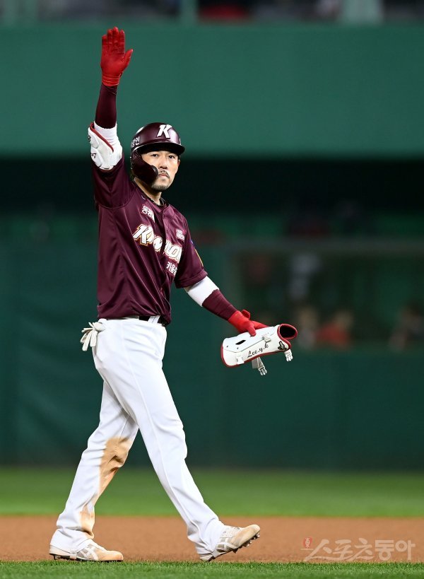 19일 인천 SSG 랜더스필드에서 ‘2022 신한은행 SOL KBO리그’ SSG 랜더스와 키움 히어로즈의 경기가 열렸다. 9회초 2사 2루에서 키움 이용규가 1타점 2루타를 날린 후 세리머니를 펼치고 있다. 이날 2루타를 기록하며 역대 15번째 2000안타를 달성했다.