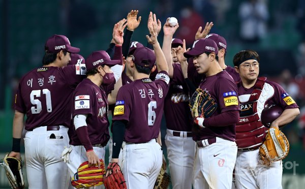 19일 인천 SSG 랜더스필드에서 ‘2022 신한은행 SOL KBO리그’ SSG 랜더스와 키움 히어로즈의 경기가 열렸다. 키움이 SSG를 상대로 8-5로 승리한 뒤 선수들이 그라운드에서 기쁨을 나누고 있다.