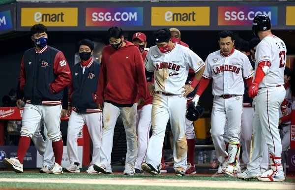 19일 인천 SSG 랜더스필드에서 ‘2022 신한은행 SOL KBO리그’ SSG 랜더스와 키움 히어로즈의 경기가 열렸다. 키움에 5-8로 패한 SSG 선수들이 고개를 숙이고 있다.