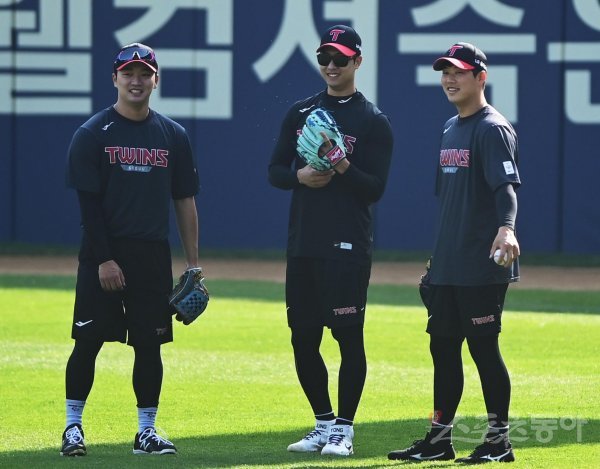 20일 서울 잠실야구장에서 열린 ‘2022 신한은행 SOL KBO리그’ LG 트윈스와 KT 위즈의 경기에 앞서 LG 고우석, 이정용, 함덕주가 외야에서 이야기를 하고 있다.