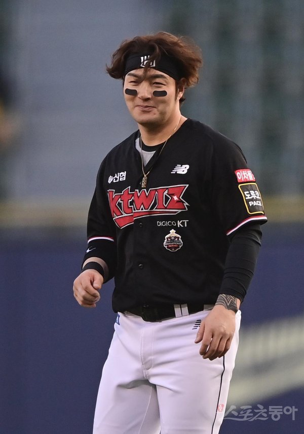 20일 서울 잠실야구장에서 열린 ‘2022 신한은행 SOL KBO리그’ LG 트윈스와 KT 위즈의 경기에서 1회초 2사 3루 KT 박병호가 선제 1타점을 쳐낸 뒤 공수 교대 때 동료를 보며 웃고 있다.
