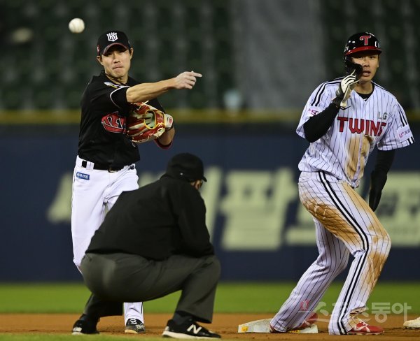 20일 서울 잠실야구장에서 열린 ‘2022 신한은행 SOL KBO리그’ LG 트윈스와 KT 위즈의 경기에서 6회말 무사 1루 LG의 내야 땅볼을 잡은 KT 심우준이 1루로 송구하고 있다.