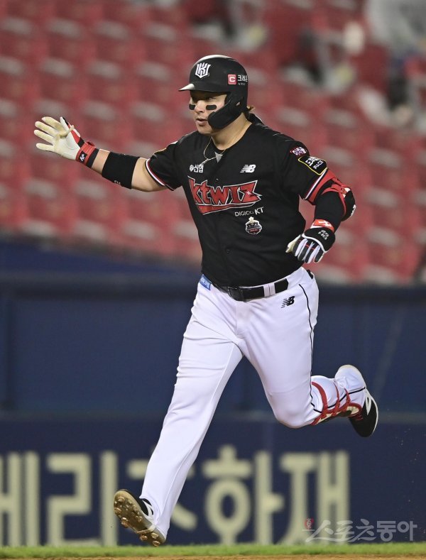 20일 서울 잠실야구장에서 열린 ‘2022 신한은행 SOL KBO리그’ LG 트윈스와 KT 위즈의 경기에서 7회초 무사 KT 박병호가 좌월 솔로 홈런을 쳐낸 뒤 세리머니를 하고 있다.