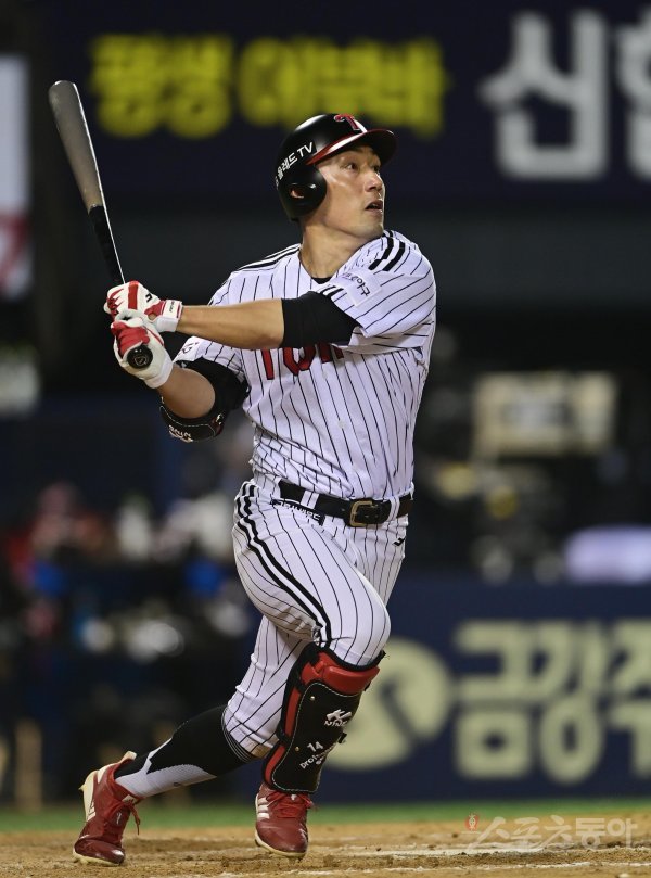 20일 서울 잠실야구장에서 열린 ‘2022 신한은행 SOL KBO리그’ LG 트윈스와 KT 위즈의 경기에서 8회말 무사 2루 LG 서건창이 우월 투런 홈런을 치고 있다.
