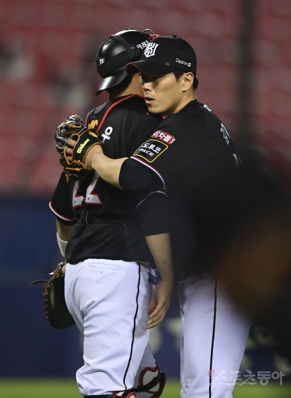 20일 서울 잠실야구장에서 열린 ‘2022 신한은행 SOL KBO리그’ LG 트윈스와 KT 위즈의 경기에서 LG에 5-3으로 승리한 KT 김재윤이 포수와 기쁨을 나누고 있다.