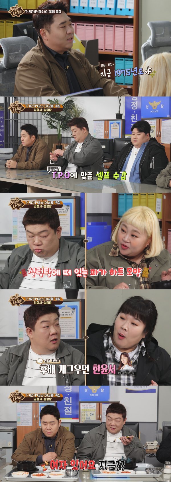 이후 그때 그 시절 수많은 영화에 등장했던 유치장 설렁탕 먹기에 도전한 뚱5. 그중에서도 "느낌을 살리려고 일부러 안 풀었다"면서 수갑을 찬 채로 설렁탕을 먹던 유민상은 배우 원빈이 자신보다 형이라고 밝혀 놀라움을 안겼다.