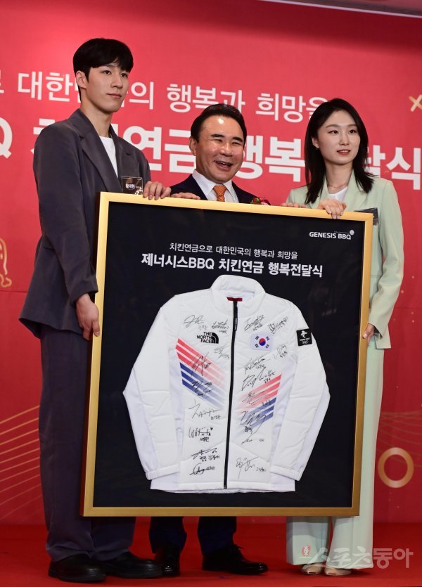 21일 서울 중구 소공동 롯데호텔에서 열린 ‘제너시스BBQ ’치킨연금‘ 행복 전달식에서 쇼트트랙 황대헌과 최민정이 사인한 단복을 윤홍근 BBQ 회장에게 전달하고 있다.