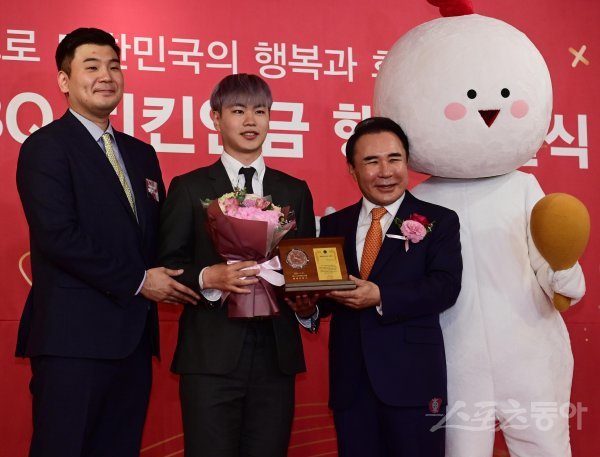 21일 서울 중구 소공동 롯데호텔에서 열린 ‘제너시스BBQ ’치킨연금‘ 행복 전달식에서 스피드스케이팅 김민석이 치킨연금을 받아 윤홍근 BBQ 회장과 기념 촬영을 하고 있다.