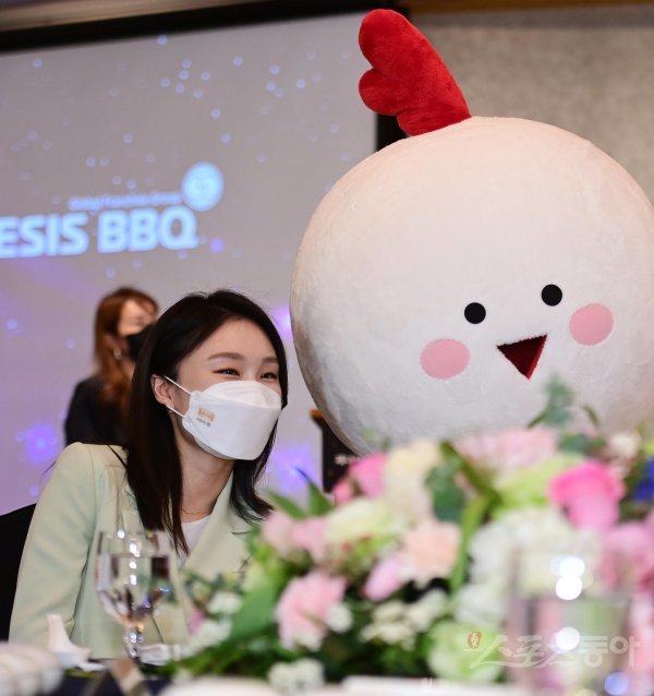 21일 서울 중구 소공동 롯데호텔에서 열린 ‘제너시스BBQ ’치킨연금‘ 행복 전달식에서 쇼트트랙 최민정이 닭 인형과 포즈를 취하고 있다.