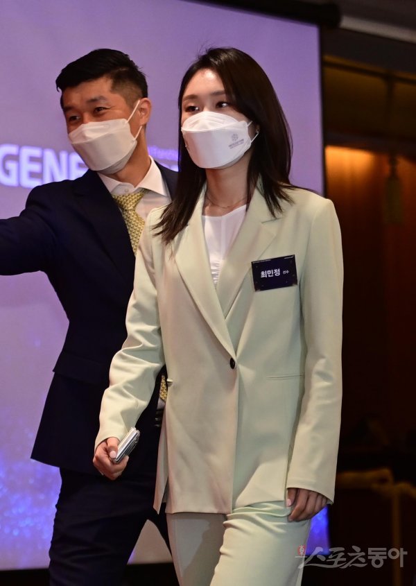 21일 서울 중구 소공동 롯데호텔에서 열린 ‘제너시스BBQ ’치킨연금‘ 행복 전달식에서 쇼트트랙 최민정이 입장하고 있다.