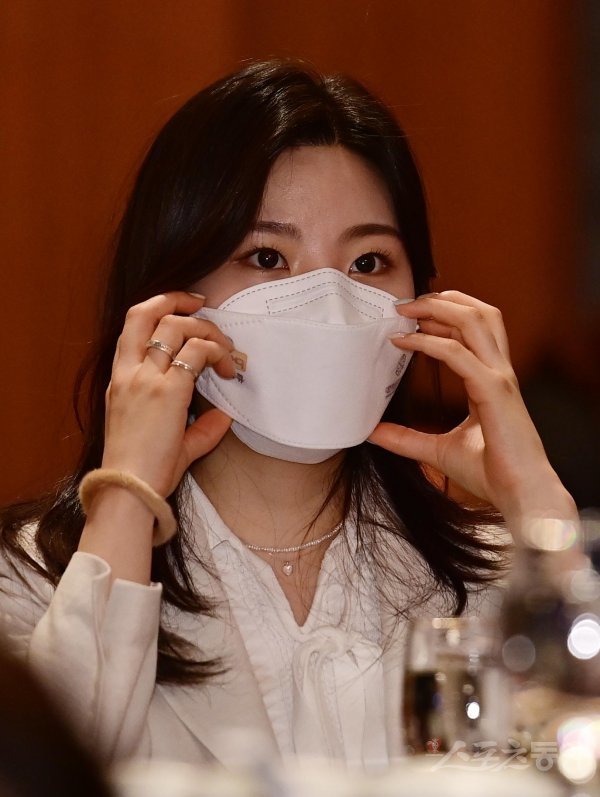 21일 서울 중구 소공동 롯데호텔에서 열린 ‘제너시스BBQ ’치킨연금‘ 행복 전달식에서 쇼트트랙 이유빈이 마스크를 고쳐쓰고 있다.