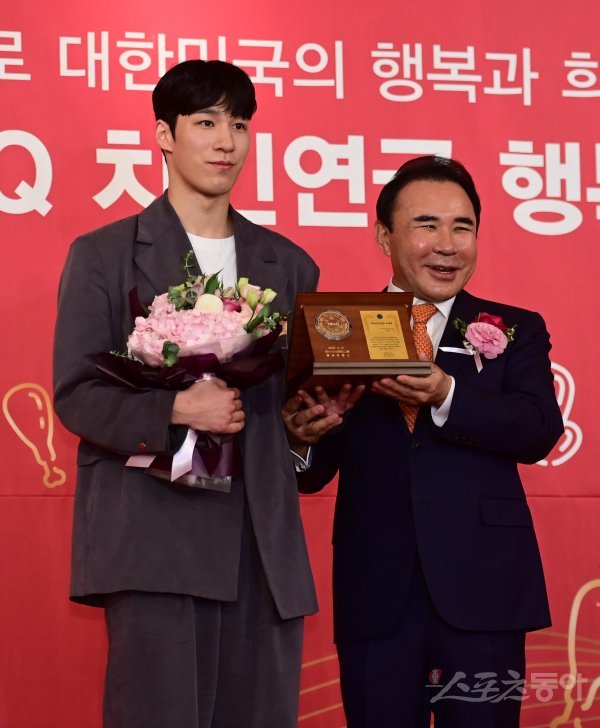 21일 서울 중구 소공동 롯데호텔에서 열린 ‘제너시스BBQ ’치킨연금‘ 행복 전달식에서 쇼트트랙 황대헌이 치킨연금 메달을 수상한 뒤 윤홍근 BBQ 회장과 기념 촬영을 하고 있다.