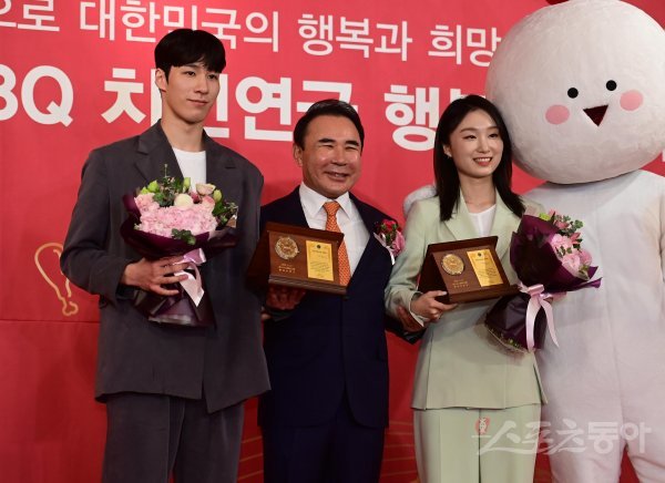 21일 서울 중구 소공동 롯데호텔에서 열린 ‘제너시스BBQ ’치킨연금‘ 행복 전달식에서 쇼트트랙 황대헌과 최민정이 치킨 연금 메달을 수상한 뒤 윤홍근 BBQ 회장과 기념 촬영을 하고 있다.