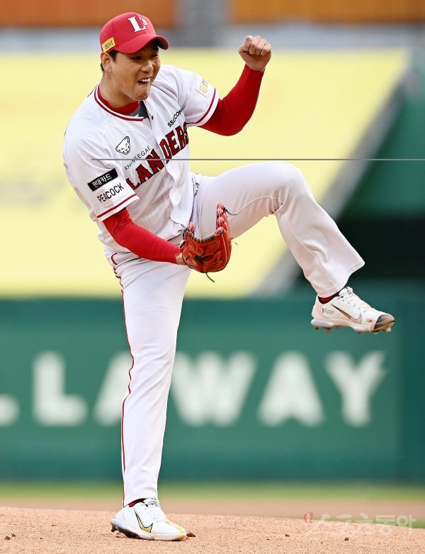 21일 인천 SSG 랜더스필드에서 ‘2022 신한은행 SOL KBO리그’ SSG 랜더스와 키움 히어로즈의 경기가 열렸다. SSG 선발투수 김광현이 힘차게 볼을 던지고 있다.