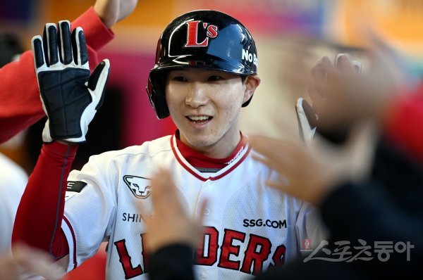 21일 인천 SSG 랜더스필드에서 ‘2022 신한은행 SOL KBO리그’ SSG 랜더스와 키움 히어로즈의 경기가 열렸다. 2회말 2사 3루에서 SSG 박성한이 적시타 때 득점을 올린 후 동료들의 환영을 받고 있다.