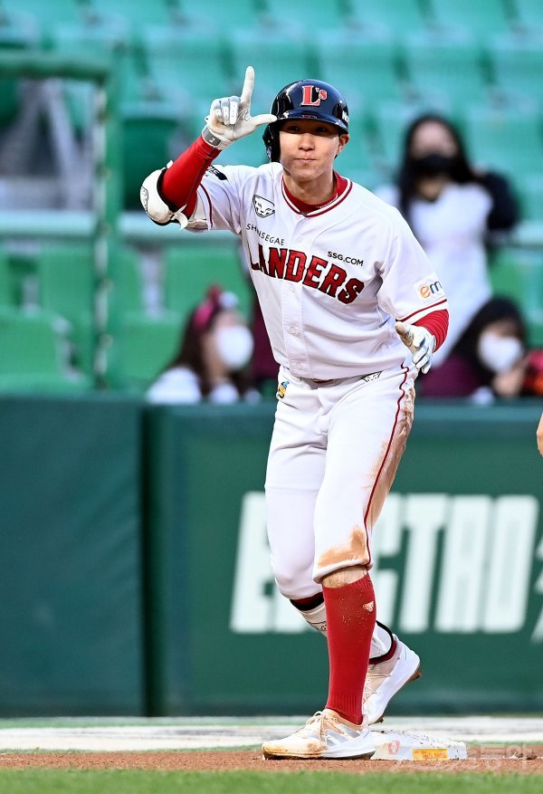 21일 인천 SSG 랜더스필드에서 ‘2022 신한은행 SOL KBO리그’ SSG 랜더스와 키움 히어로즈의 경기가 열렸다. 2회말 1사 1루에서 SSG 박성한이 1타점 3루타를 날린 후 세리머니를 펼치고 있다.