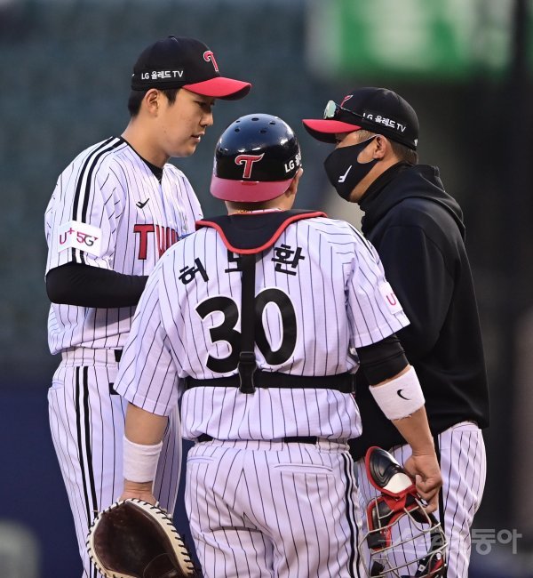 21일 서울 잠실야구장에서 열린 ‘2022 신한은행 SOL KBO리그’ LG 트윈스와 KT 위즈의 경기에서 2회초 1사 1, 2루 상황에서 LG 손주영이 투수 코치와 이야기를 하고 있다.