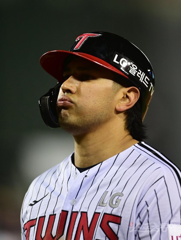 21일 서울 잠실야구장에서 열린 ‘2022 신한은행 SOL KBO리그’ LG 트윈스와 KT 위즈의 경기에서 5회말 1사 1루 LG 루이즈가 좌익수 뜬공으로 물러나며 아쉬워하고 있다.