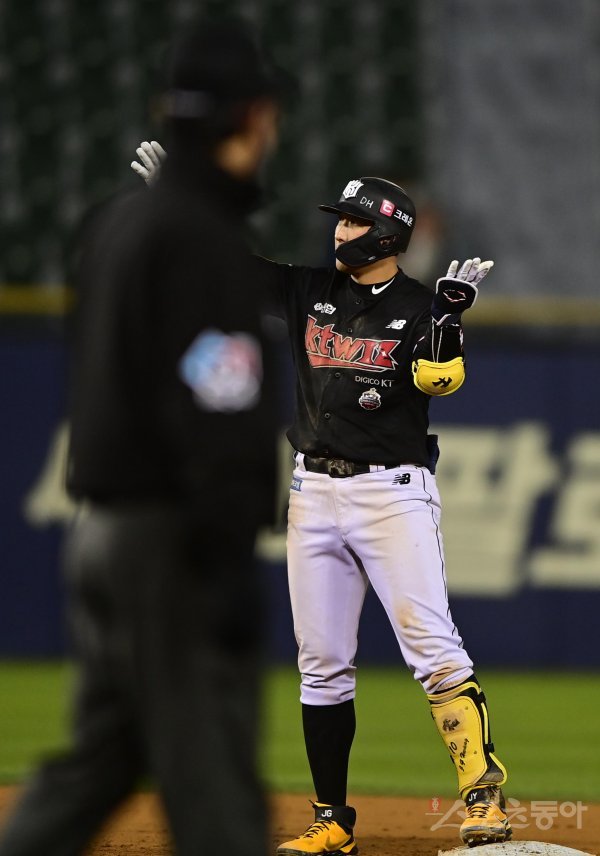 21일 서울 잠실야구장에서 열린 ‘2022 신한은행 SOL KBO리그’ LG 트윈스와 KT 위즈의 경기에서 4회초 2사 1, 2루 KT 황재균이 1타점 적시타를 쳐낸 뒤 세리머니를 하고 있다.