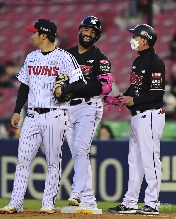 21일 서울 잠실야구장에서 열린 ‘2022 신한은행 SOL KBO리그’ LG 트윈스와 KT 위즈의 경기에서 2회초 2사 만루 KT 라모스가 2타점 우전 적시타를 쳐낸 뒤 기뻐하고 있다.
