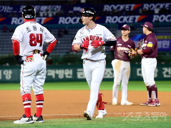 21일 인천 SSG 랜더스필드에서 ‘2022 신한은행 SOL KBO리그’ SSG 랜더스와 키움 히어로즈의 경기가 열렸다. 7회말 무사에서 SSG 최지훈이 안타를 날린 후 1루에서 태그 아웃되자 아쉬워하고 있다.