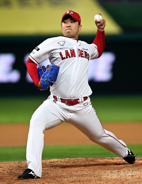 21일 인천 SSG 랜더스필드에서 ‘2022 신한은행 SOL KBO리그’ SSG 랜더스와 키움 히어로즈의 경기가 열렸다. 9회초 무사에서 SSG 마무리 김택형이 구원 등판해 볼을 던지고 있다.