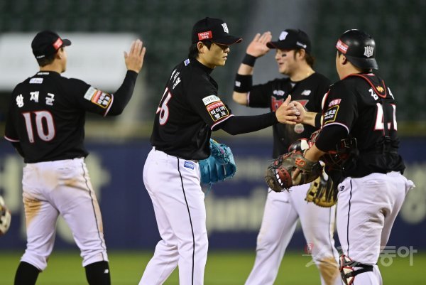 21일 서울 잠실야구장에서 열린 ‘2022 신한은행 SOL KBO리그’ LG 트윈스와 KT 위즈의 경기에서 LG에 6-2로 승리한 KT 박시영이 포수와 기쁨을 나누고 있다.
