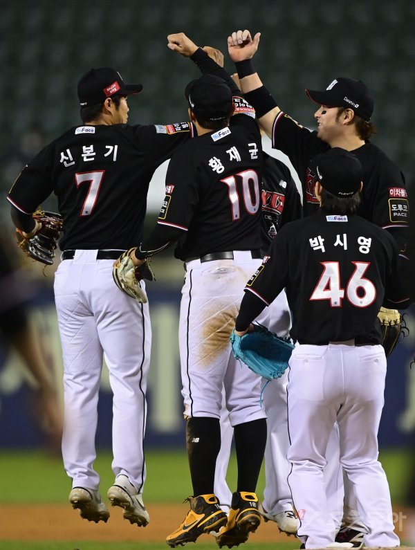 21일 서울 잠실야구장에서 열린 ‘2022 신한은행 SOL KBO리그’ LG 트윈스와 KT 위즈의 경기에서 LG에 6-2로 승리한 KT 선수들이 기쁨을 나누고 있다.