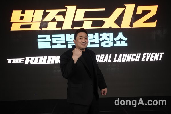 마동석이 22일 오전 생중계된 영화 ‘범죄도시2’의 글로벌 런칭쇼에서 포즈를 취하고 있다.