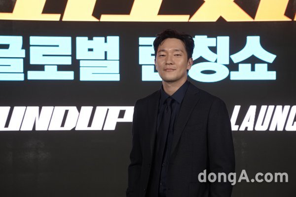 손석구가 22일 오전 생중계된 영화 ‘범죄도시2’의 글로벌 런칭쇼에서 포즈를 취하고 있다.