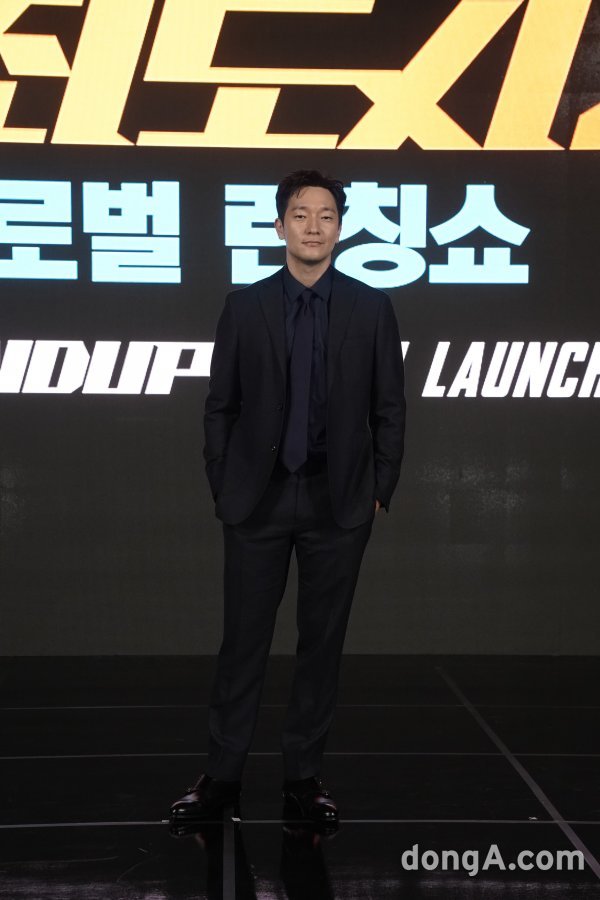 손석구가 22일 오전 생중계된 영화 ‘범죄도시2’의 글로벌 런칭쇼에서 포즈를 취하고 있다.