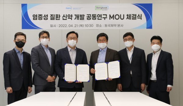 동국제약(대표이사 송준호)은 면역신약개발 바이오기업 샤페론과 업무협약을 맺고 염증성 질환 신약개발을 위한 공동연구를 진행한다.이번 업무협약을 통해 두 기업은 세계 최초로 염증복합체를 이중으로 억제하는 신약 후보물질에 대한 공동 연구개발을 진행한다. 샤페론이 보유한 염증복합체 억제제는 염증 활성단계는 물론 염증 시작단계의 염증신호 산물과 사이토카인을 포괄적으로 억제한다. 현재 가장 우수한 항염증 효과가 있는 스테로이드 약물과 대표적인 항염증 약물인 JAK 억제제(비스테로이드 계열의 약물)를 대체하기 위해 개방중인 난치성 염증질환 신약후보 물질이다. 샤페론은 현재 코로나19 바이러스에 의한 폐렴 치료제 누세핀(NuSepin), 아토피 피부염 치료제 ‘누겔(NuGel), 알츠하이머 치매 치료제 누세린(NuCerin)에 대하여 임상을 진행하고 있다.