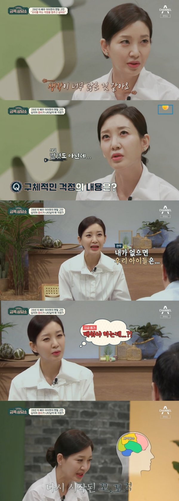 22일 오후 방송된 채널A 예능프로그램 ‘오은영의 금쪽상담소’에서는 배우 이아현이 걱정이 너무 많아서 잠을 못잔다고 하소연하는 장면이 그려졌다.
