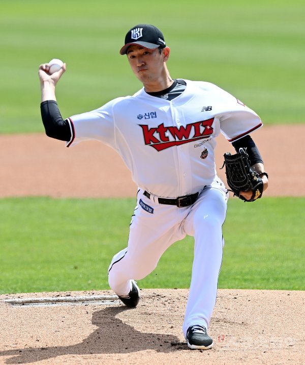 24일 경기도 수원 kt위즈파크에서 ‘2022 신한은행 SOL KBO리그’ kt 위즈와 NC 다이노스의 경기가 열렸다. kt 선발투수 고영표가 힘차게 볼을 던지고 있다.