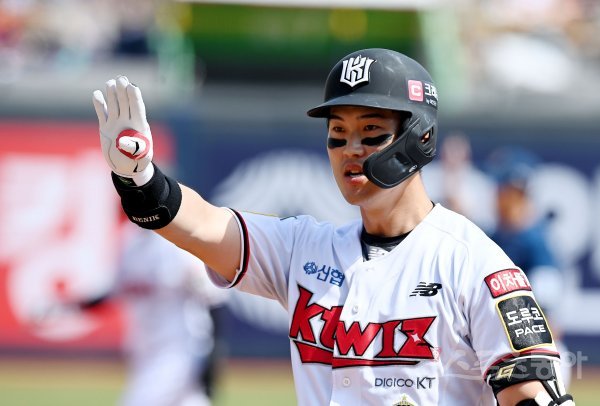 24일 경기도 수원 kt위즈파크에서 ‘2022 신한은행 SOL KBO리그’ kt 위즈와 NC 다이노스의 경기가 열렸다. 2회말 1사 1, 2루에서 kt 배정대가 1타점 적시타를 날린 후 환호하고 있다.