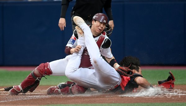 24일 서울 고척스카이돔에서 ‘2022 신한은행 MY CAR KBO리그’ KIA 타이거즈와 키움 히어로즈 경기가 열렸다. 3회초 1사 1,2루 KIA 김규성 내야 땅볼 때 3루주자 김석환이 홈으로 달려 세이프 되고 과정에서 키움 김재현이 부상을 당하고 있다.