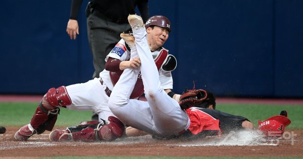 24일 서울 고척스카이돔에서 ‘2022 신한은행 MY CAR KBO리그’ KIA 타이거즈와 키움 히어로즈 경기가 열렸다. 3회초 1사 1,2루 KIA 김규성 내야 땅볼 때 3루주자 김석환이 홈으로 달려 세이프 되고 과정에서 키움 김재현이 부상을 당하고 있다.
