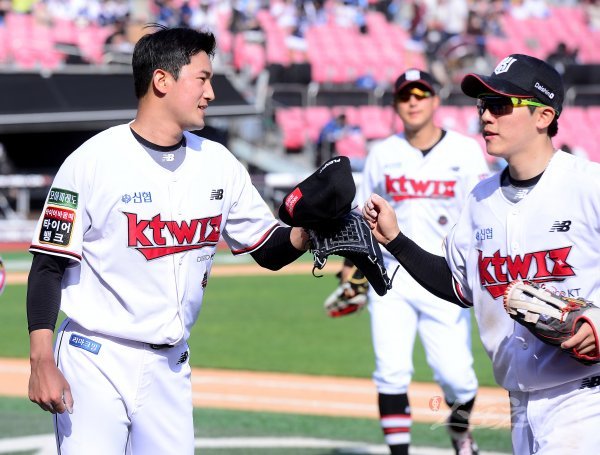 24일 경기도 수원 kt위즈파크에서 ‘2022 신한은행 SOL KBO리그’ kt 위즈와 NC 다이노스의 경기가 열렸다. 7회까지 NC 공격을 1실점으로 막은 kt 선발 고영표가 이닝 종료 후 동료들을 격려하고 있다.