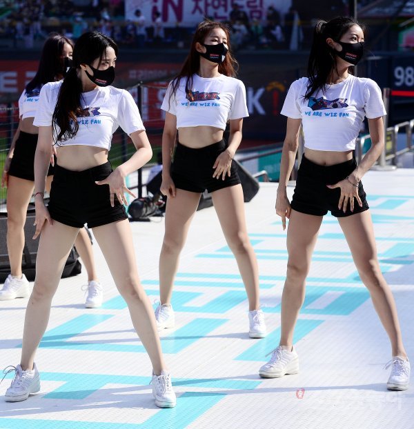 24일 경기도 수원 kt위즈파크에서 ‘2022 신한은행 SOL KBO리그’ kt 위즈와 NC 다이노스의 경기가 열렸다. kt 치어리더가 화려한 공연을 펼치고 있다.