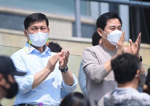 24일 서울 잠실야구장에서 열린 ‘2022 신한은행 SOL KBO리그’ 두산 베어스와 LG 트윈스의 경기에 앞서 허구연 KBO 총재와 오세훈 서울시장이 손뼉을 치고 있다.