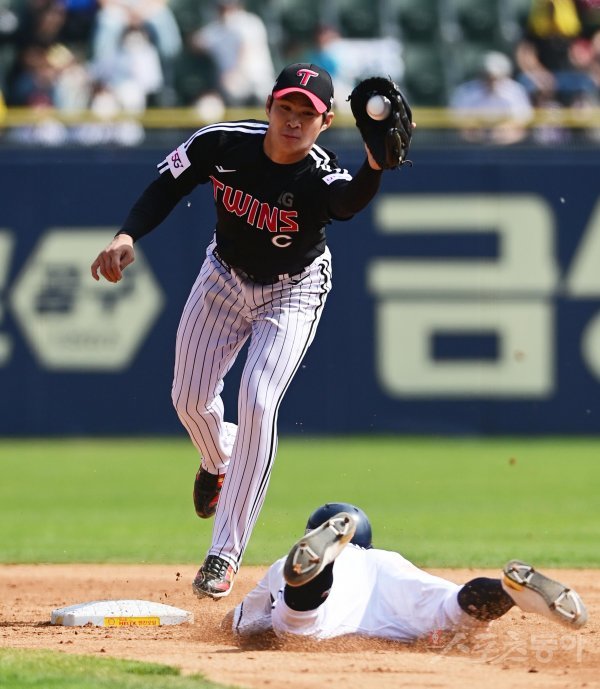 24일 서울 잠실야구장에서 열린 ‘2022 신한은행 SOL KBO리그’ 두산 베어스와 LG 트윈스의 경기에서 4회말 2사 1루 상황에서 LG 오지환이 도루를 시도한 1루주자를 태그 아웃시키고 있다.