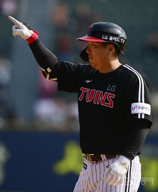 24일 서울 잠실야구장에서 열린 ‘2022 신한은행 SOL KBO리그’ 두산 베어스와 LG 트윈스의 경기에서 6회초 1사 1, 3루 LG 김현수가 1타점 중전 적시타를 더그아웃을 향해 세리머니를 하고 있다.