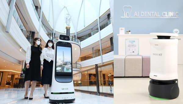 LG전자 ‘클로이’·KT ‘AI방역로봇’(오른쪽).