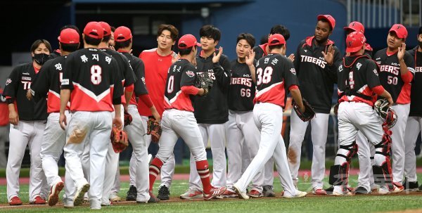 24일 서울 고척스카이돔에서 ‘2022 신한은행 MY CAR KBO리그’ KIA 타이거즈와 키움 히어로즈 경기가 열렸다. 14-2 대승을 거둔 KIA 선수들이 하이파이브하고 있다.